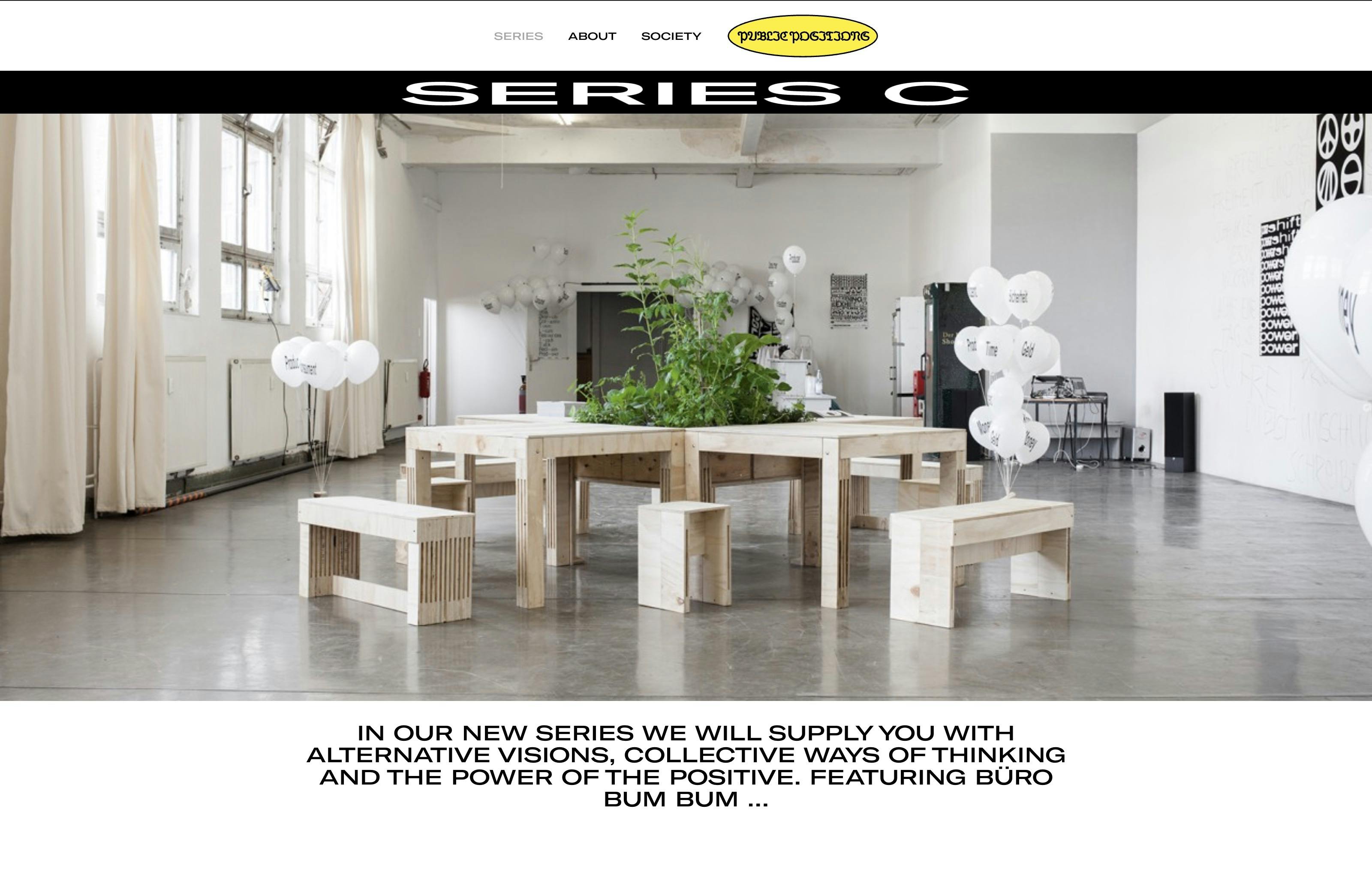The website offers a comprehensive insight into Public Position’s projects, exhibitions, and its changing roster of collaborators. PP’s signature visual language is contemporary and confrontational, employing extended, bold typography and blocky—almost dissonant—graphic elements, drawing visitors’ attention to the platform’s topics and ideas.